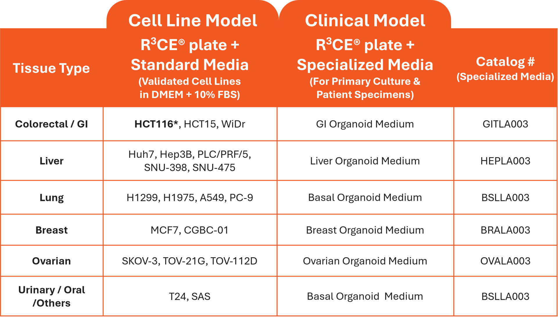 • Step 2: Graduate to the Total Solution (Clinical Model) Once the workflow is mastered, upgrade to our tissue-specific specialized media to unlock the full potential of primary cells and patient-derived specimens. Using the integrated R3CE® system (Plate + Media) is essential to ensure consistent 3D morphology and architecture for your Patient Avatars.